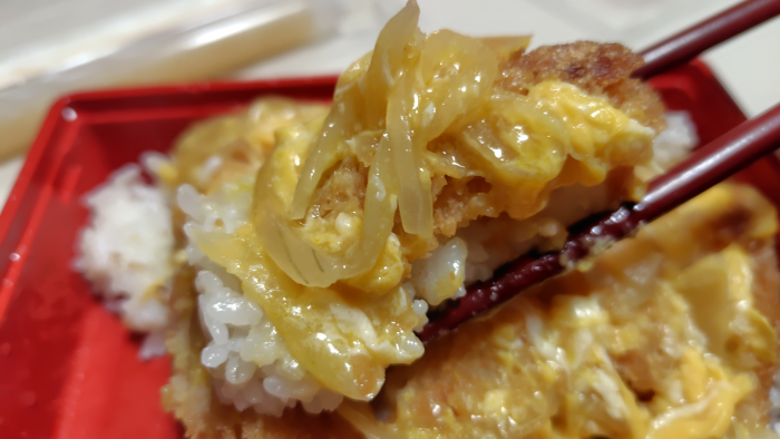 かつ丼は温めると美味しいとの事で早速レンチンして食べてみましたが、カツが衣がしっとりとしてちょっとパサついた感がある肉質を程よくカバーして玉子と玉ねぎもしっとり感を補強してくれていて食べやすいですね。