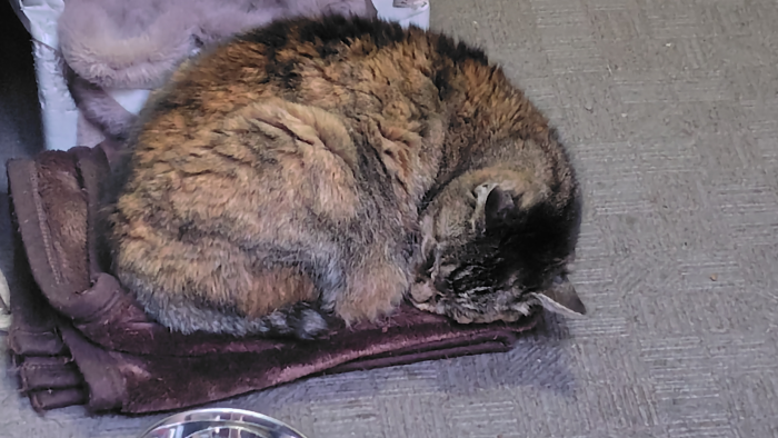 最近は威嚇しなくなってきたフシャー猫に会いに行ったら久々に出会えました。丸くなって寝ているのでパシャリとスマホで撮ってみたら、起きてこちらを見てきました。ポカーンって顔でこちらを見てボケーっと見つめられました。フシャーと威嚇もすり寄って来ることも無いので寝るの邪魔だよねと撤収しました。