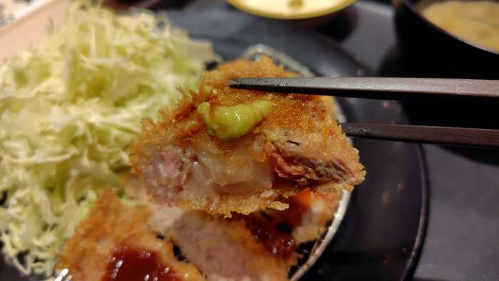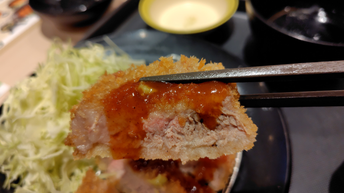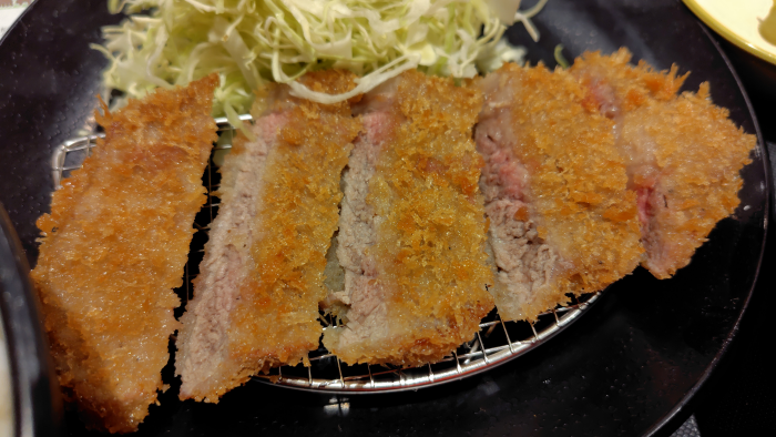 牛サーロインかつ定食の牛サーロインかつですが、写真と違って熱が通り過ぎてるのか大体白くなってますね。ちょっとピンクが残ってるけどまぁ火が通った方が安心だよね。