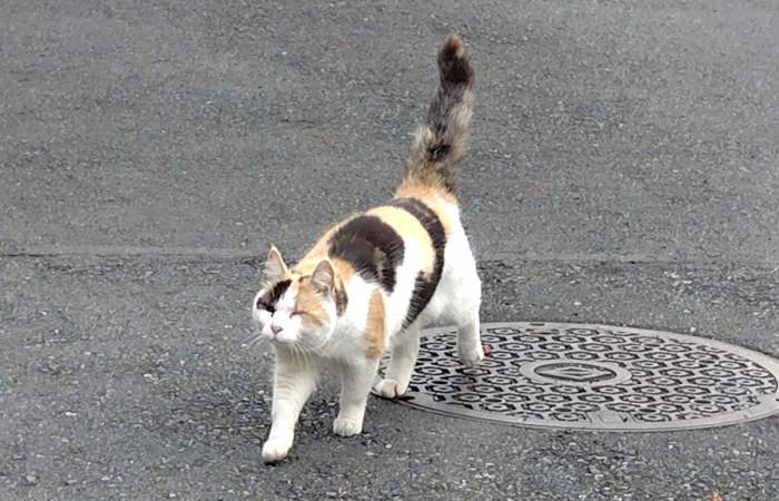 いつもよく見かける福顔な感じの三毛ちゃんが、自分に気が付いてテコテコ寄ってくるけど目が悪いから変な方向に向かう姿をパシャリと撮ってみました。この後足にスリスリしてきたりゴロンとしたのでわしゃわしゃと遊んでみました。