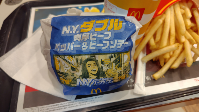 2月4日からマクドナルドが新作バーガーのN.Y.バーガーズを販売開始しました。なかにはN.Y. ダブル肉厚ビーフ ペッパー&ビーフソテーって夜の倍バーガーってのが販売してるので優待券で食べに来てみました。