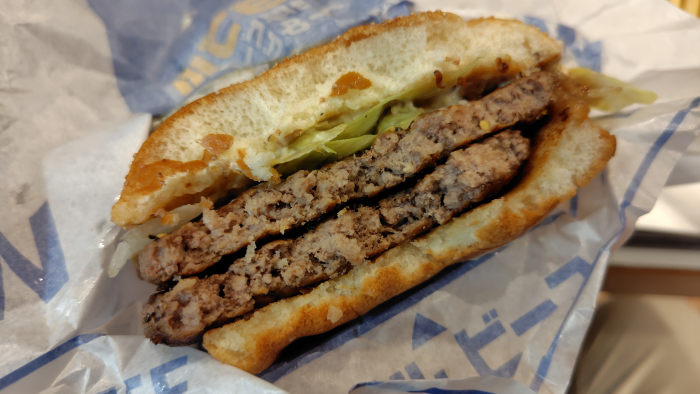 食べてみるとちょっと硬めのパンズとシャキシャキのレタスに名前通りの肉厚ビーフが2枚もありかみ切るのにちょっと大変かなって感じですね。口の中に圧倒的な肉を感じながら口の中の水分がパティやパンズに取られそうになるけど、レタスが水分を補給してくれるのでパサつかずに食べる事ができました。