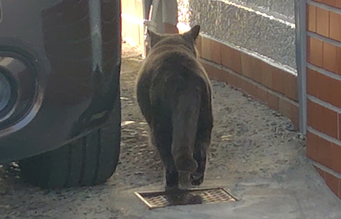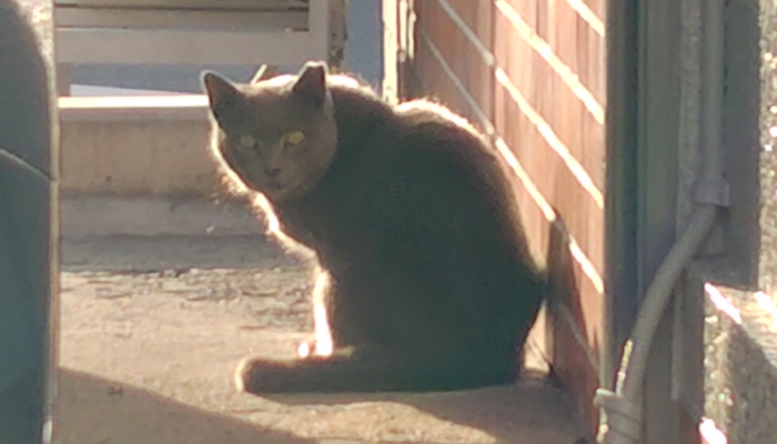 隣街でよく見かけるロシアンブルーっぽい野良猫がトコトコ歩いてる姿を見つけたので、スマホでパシャっと撮ったら音か気配に気が付かれ振り返ったので更に撮ってみました。驚いた感じの顔しててかわいいね。