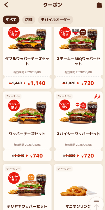 春のワッパー祭りという事で5品目のワッパーセットが300円引きなので注文していこうかと思います。