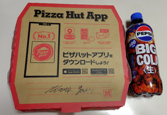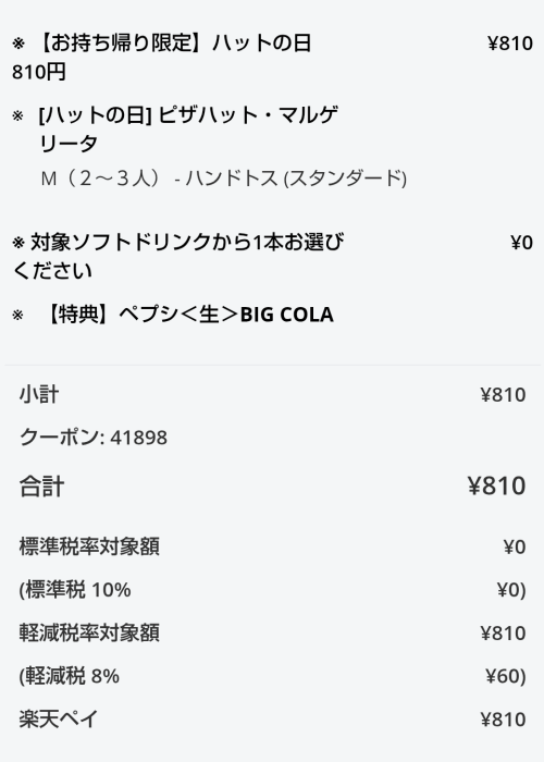 ハットの日のピザハットのマルゲリータを注文しつつ無料クーポンを使ってペプシをも付けちゃいます。