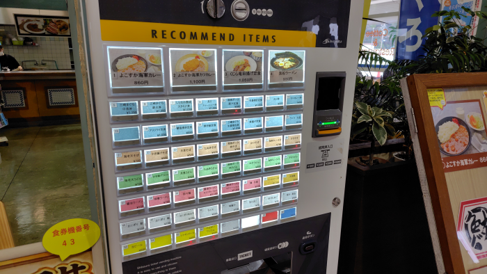 店内のコーラルで昼飯を食べていこうと寄って券売機に寄ってみました。湘南ポーク肉そばとおにぎり明太子を頼んでみました。