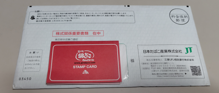 日本たばこ産業株式会社から株主総会招集通知が届いたのでお土産があるかを開封して確認していこうかと思います。