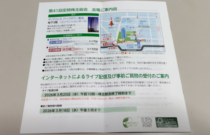 裏面の交通機関のご案内の下に「株主総会のお土産はご用意しておりません。」との記載があるので