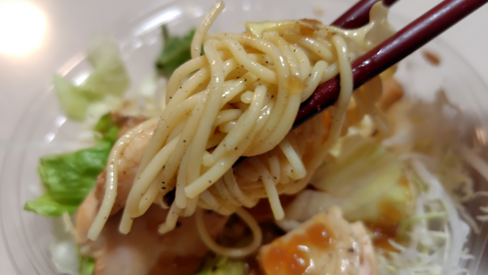 開封してタレをかけて食べてみたけどパスタはタレの味が丁度いいバランスで野菜と食べるとさっぱりしてて美味しいね。ちょっと暑かったから良かったですね。