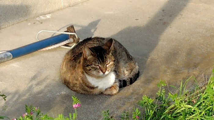 前回のアライグマが堂々と歩いてる時に我関せずって感じで微動だにせず座ってる猫ちゃん。早く追い払えって感じで凄いこっちを睨んでました。てっきりアライグマに喧嘩を売るかと思ったけどアライグマが庭から出ていっても最後までピクリとも動かなかったですね。