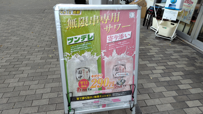 串カツ田中で無限串用サワーが平日だけ290円で飲めるって事で試しに来てみました。味はツンデレと寄り添いがあるみたいですね。しかも期間中に5万杯超えると平日290円が継続するとかなんとか。