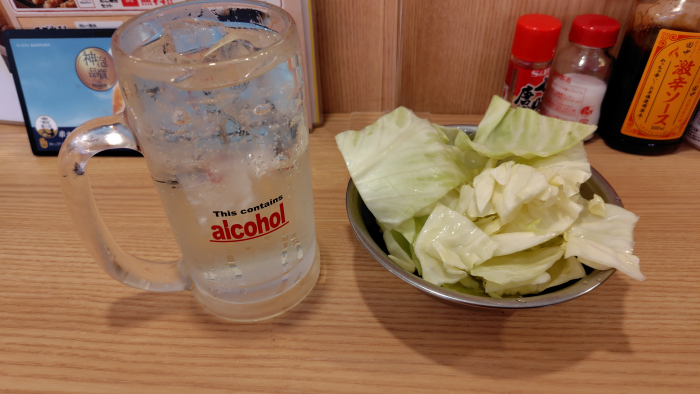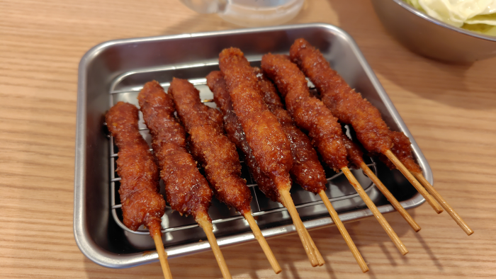 早速入店してツンデレと無限ドテ串を頼んで待ってたら、お通しキャベツとツンデレが届きました。ツンデレは酸っぱめの味で揚げ物食べるてすっきりするには丁度いい感じの味ですね。
