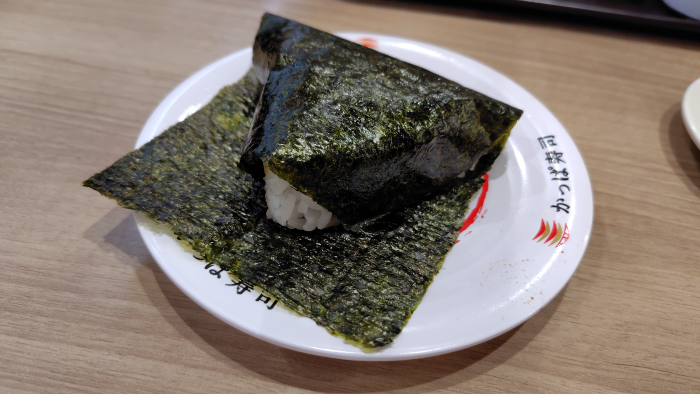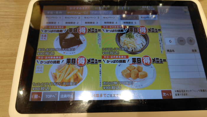 かっぱ寿司で平日マル得メニューが変わっておにぎり、うどん、ポテト、わらび餅が税込み90円となっていますね。今回はわらび餅以外を頼んでみました。