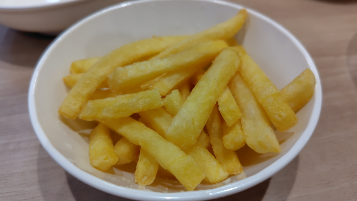 速めに来るかと思ってたポテトが最後に届きました。やっぱり揚げるのが時間かかったのかな?塩がちょっと足りない気がしたので、卓上の塩をマシマシでかけて食べたら美味しかったですね。