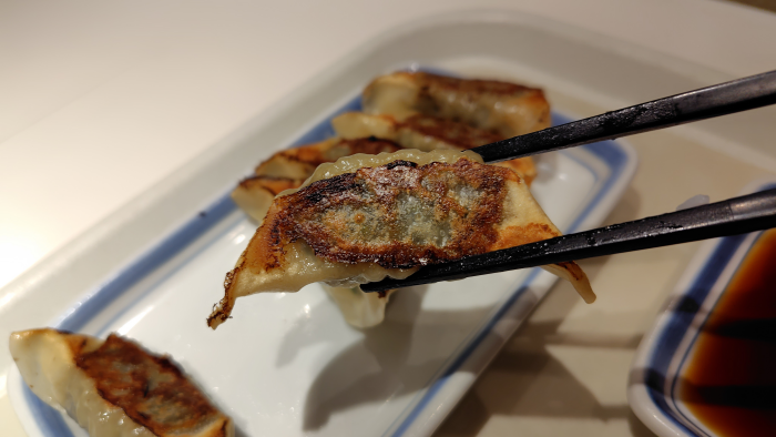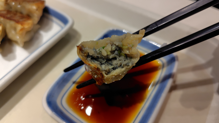 ニンニク有りの餃子なのでちょっと黒い感じですね。ニンニク有り無しで色違うけど何だろうね?