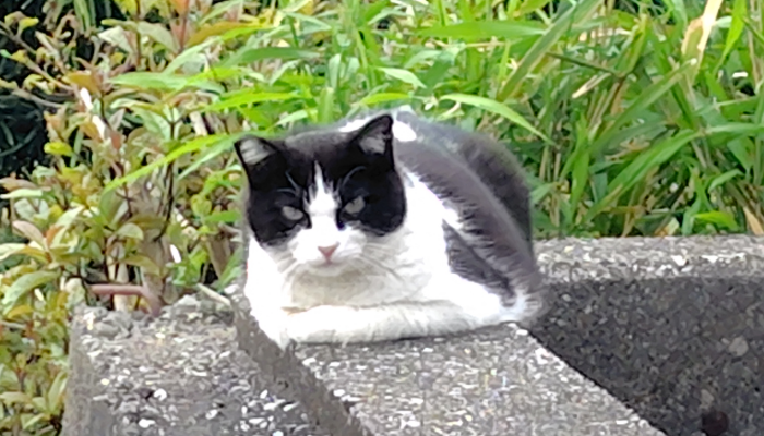 隣町からの帰り道にいつもいるハチワレちゃんが塀の上にちょこんと座ってる姿を見つけたので写真を撮ってみました。まったりしてるところを邪魔したので睨んできてました。鋭い目つきで見てきて可愛いですね。