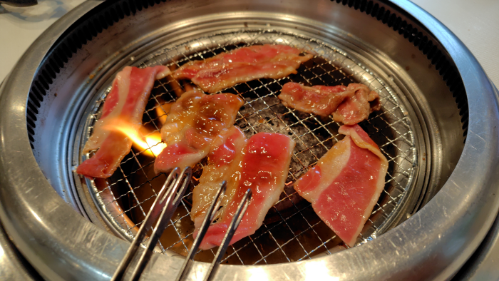 一度に全部焼いて焦げを回避するよ!生肉トングは掴みにくいのでバランスよく綺麗に配置するのは無理でしたね。