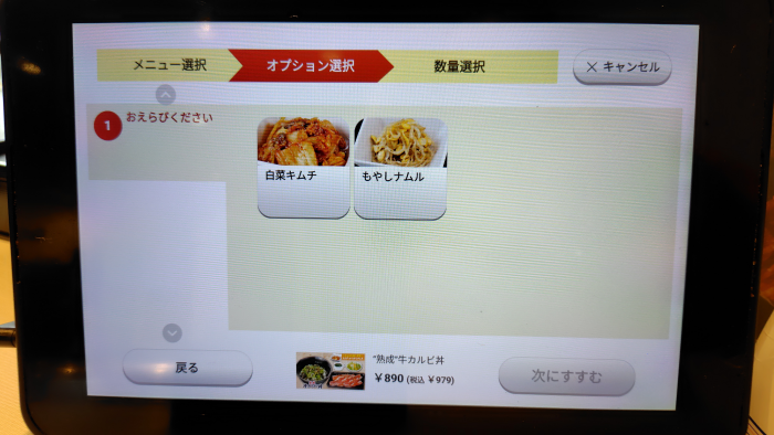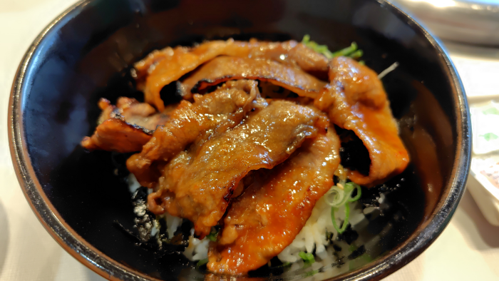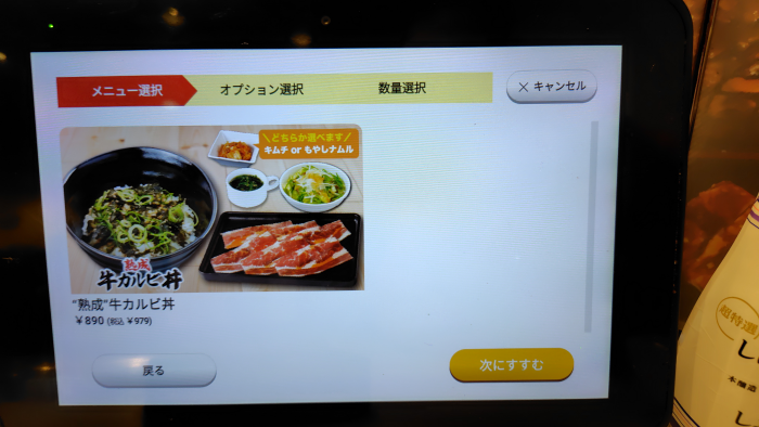 今回は熟成牛カルビ丼を選んでみて、もやしナムルを選んで注文してみたよ。前回は焦げ焦げだったので今回は肉1種類なら同じタイミングでの焼き上がりだろうし焦げないよね?との思いです。