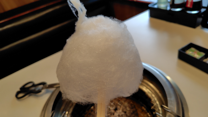 カレーのルーだけお替りしたりドリンクバーで色々炭酸ジュース飲んだりして満足したので、ラストの綿あめチャレンジをしてみました。今回はまぁまぁ綺麗な丸にできた気がします。口の中が甘くなり過ぎたので最後にコーヒー飲んでリフレッシュしました。