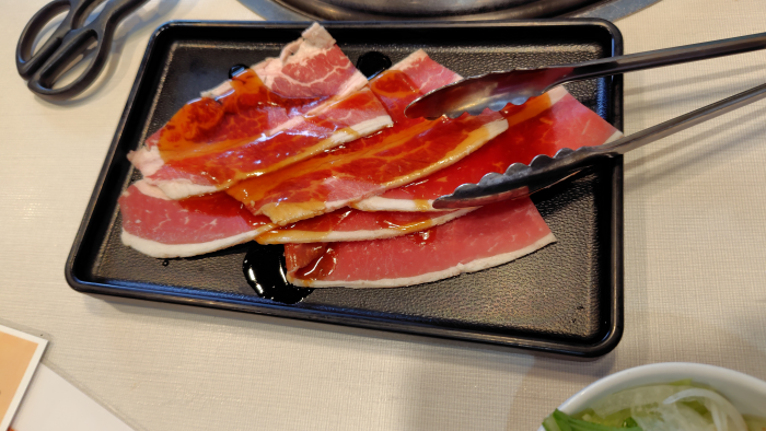 熟成牛カルビは6枚でタレがかかってるけどちょっと足りない感じですかね。それと生肉用トングは肉を剥がして掴むのに苦労しました。