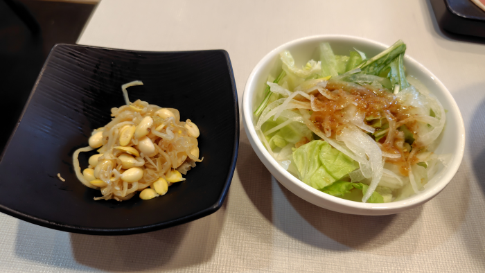料理が届いたので確認ですが、もやしナムルとドレッシング付きサラダですね。ベジファーストとして最初の方に食べていきます。