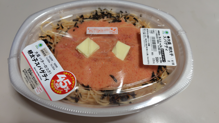明太子スパゲティはバターが2個も上に乗ってますね。単品で持ってもかなりズッシリしてますね。