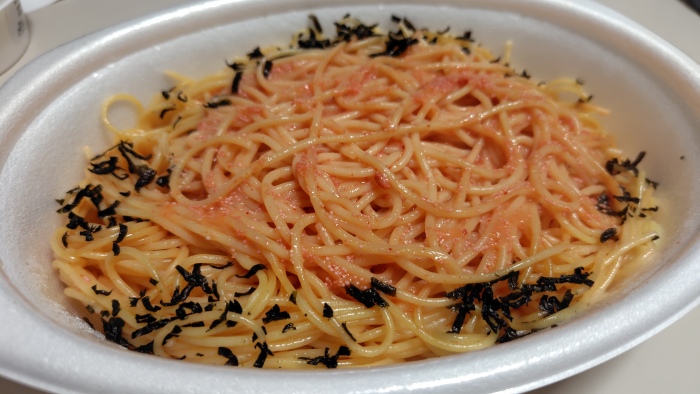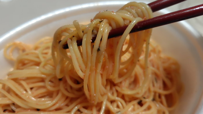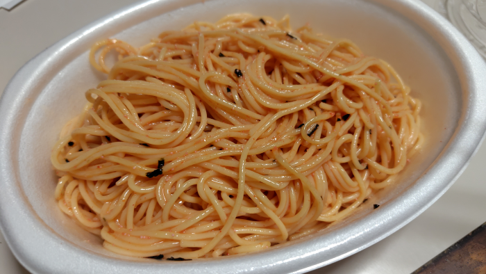 全体的に混ざったので食べてみると明太子のぷちぷちが絡まって美味しいですね。バターのパンチも追加されていて腹に貯まるのでいいけど、最後まで食べるのには味が飽きますね。タバスコとか味変できる物を用意しとくといいかもしれませんね。