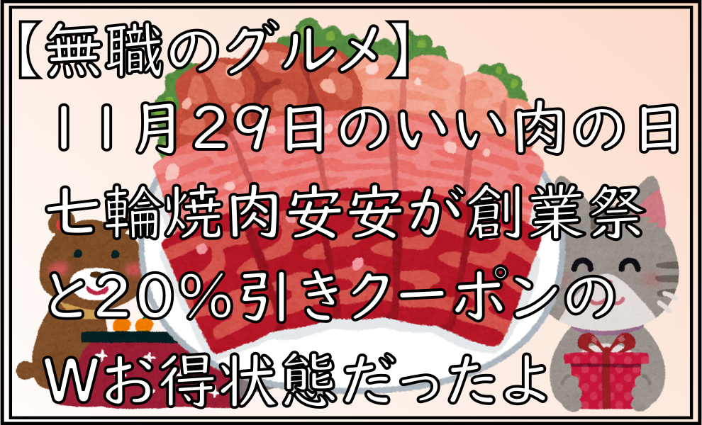 グルメ 日々の日常 【無職のグルメ】11月29日のいい肉の日七輪焼肉安安が創業祭と20%引きクーポンのWお得状態だったよ 2025年12月3日 先月の29の日は安安でお得にお安く焼肉をキメてみた猫山猫雄で…